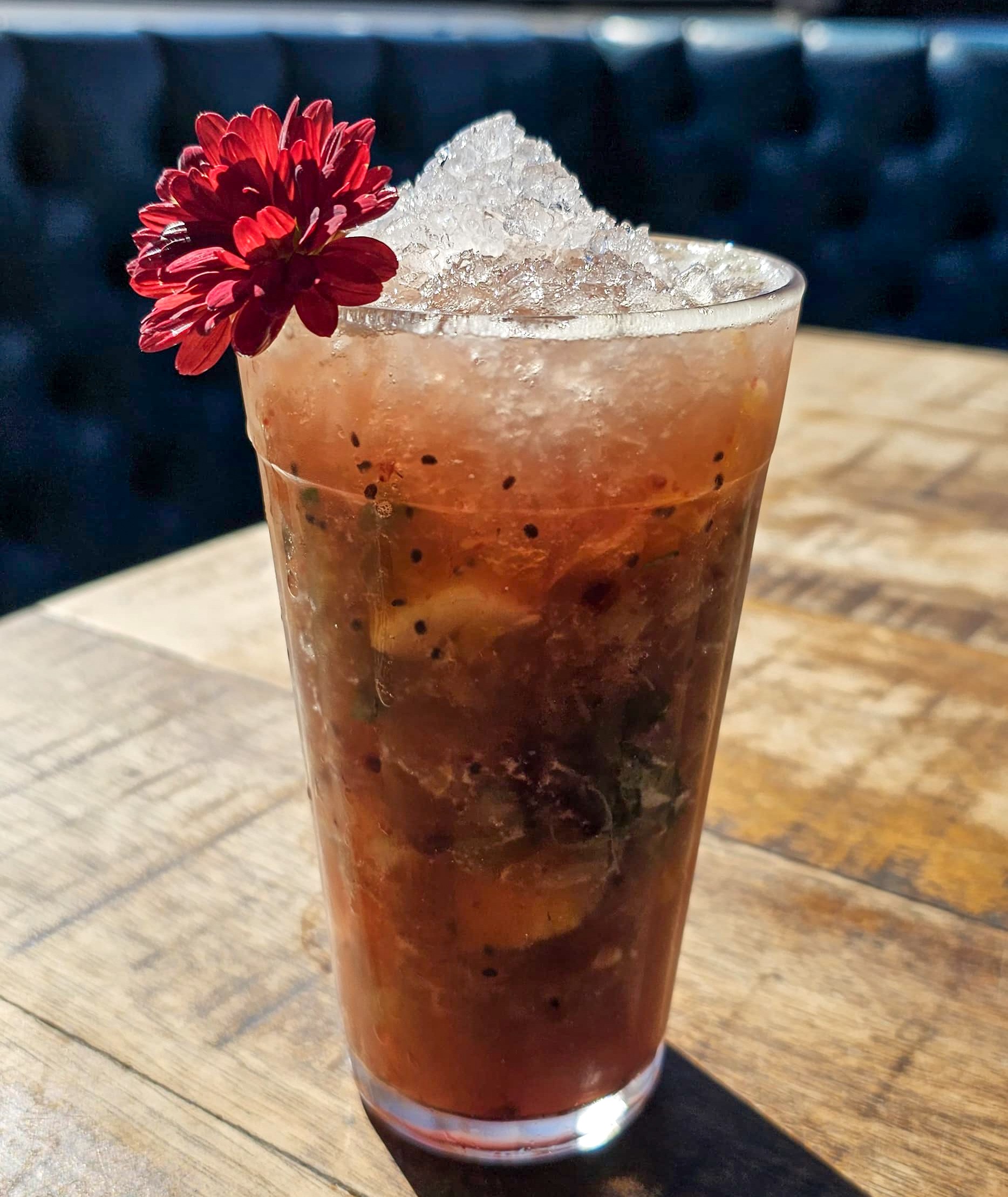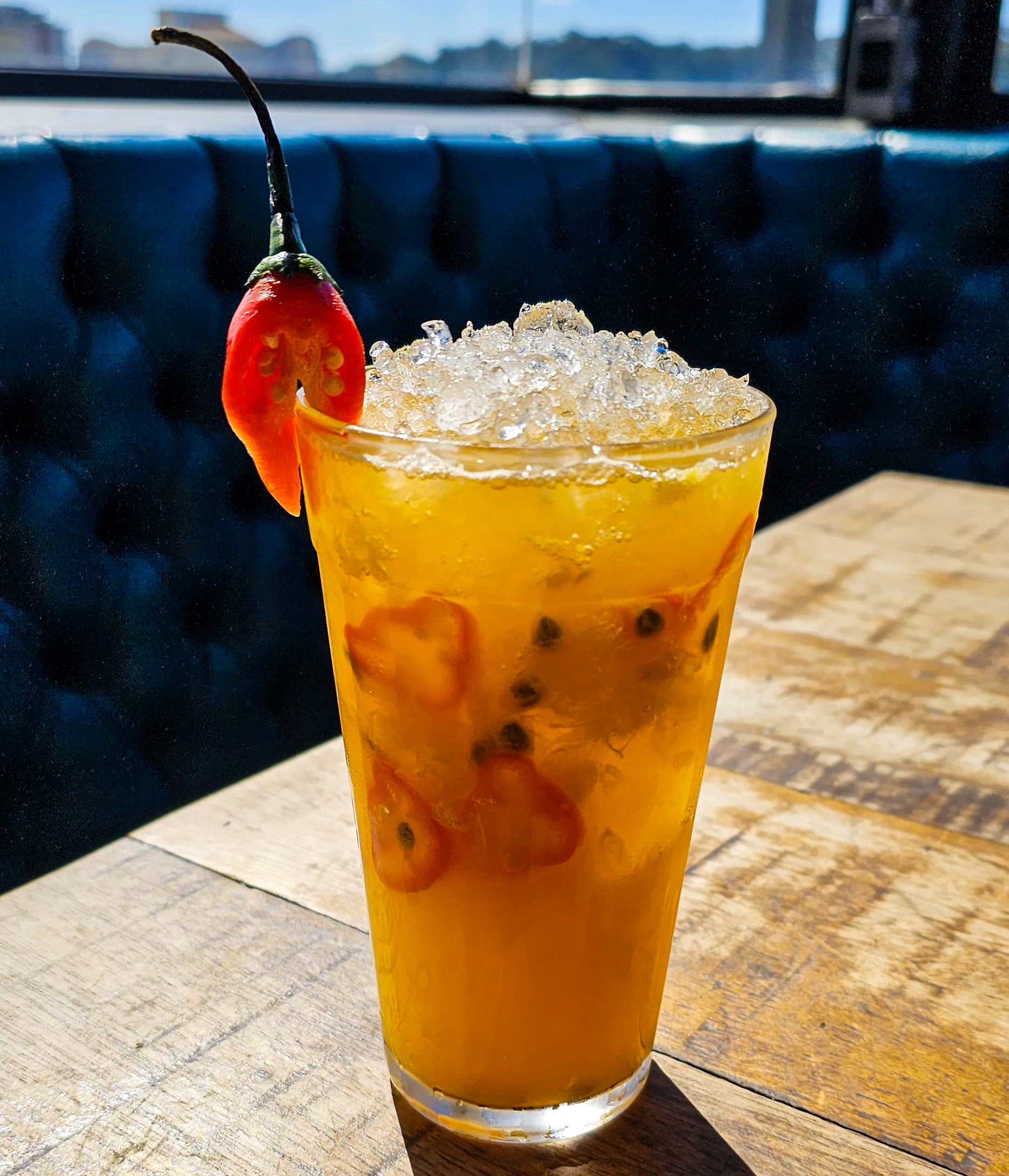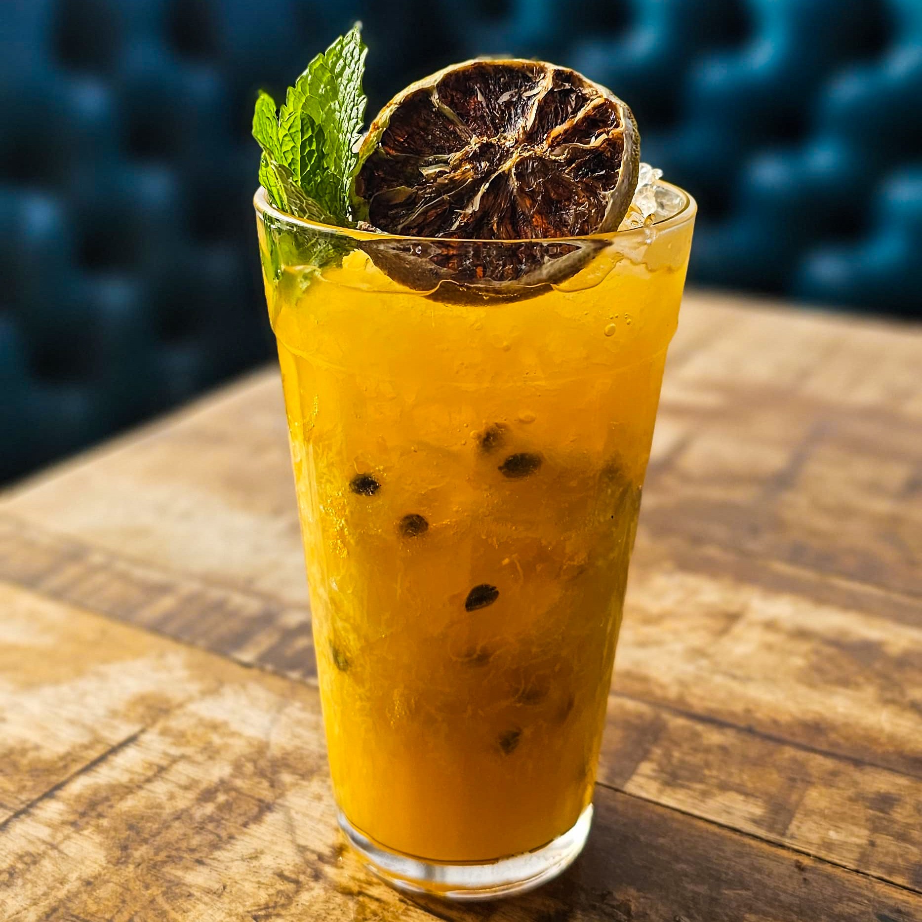 A intensidade da tequila ouro equilibrada pelo dulçor do xarope de caramelo salgado, a acidez vibrante da polpa de maracujá e o toque leve da espuma cítrica de limão, resultando em um drink marcante e cheio de contrastes.
