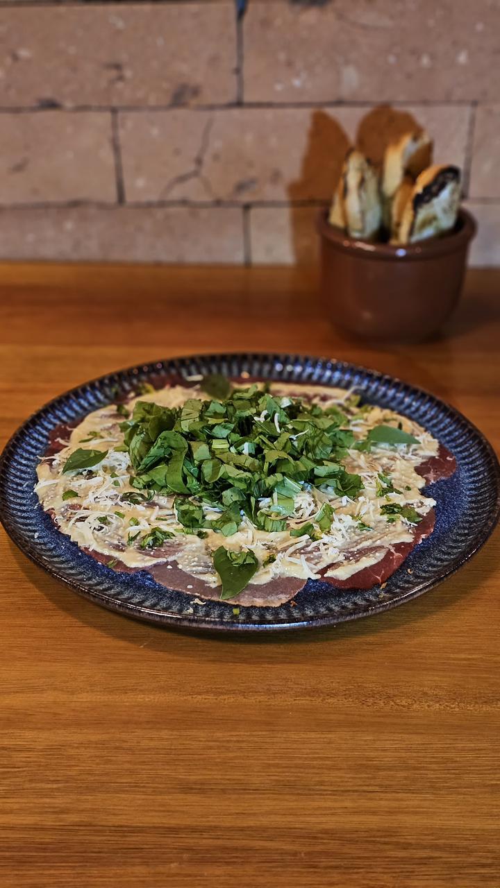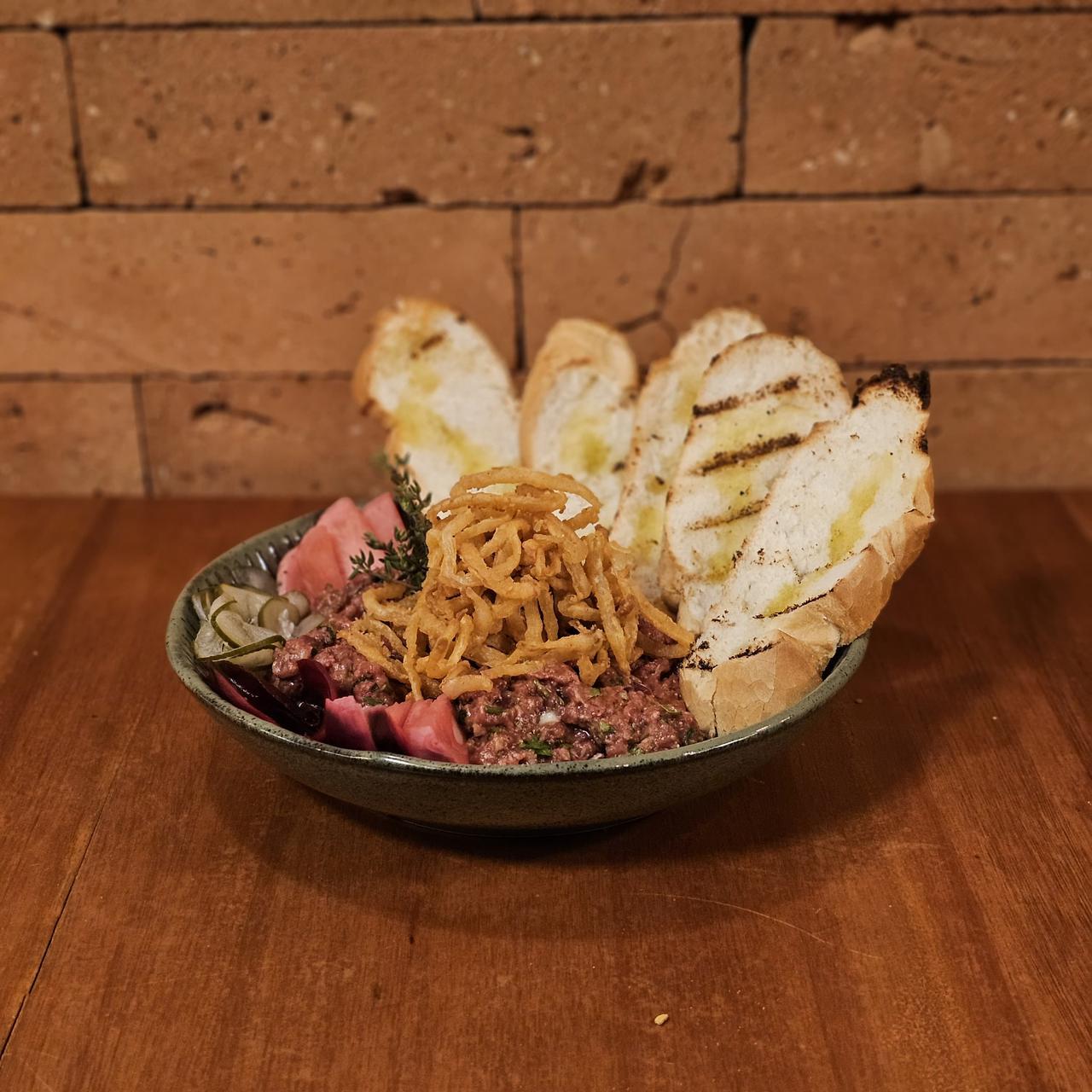 Carne bovina selecionada, cortada na ponta da faca e temperada com nosso blend especial de especiarias. Finalizada com cebola à tirolesa e servida com salada de rúcula, pão tostado e picles artesanais. Uma entrada clássica, preparada com frescor e personalidade.