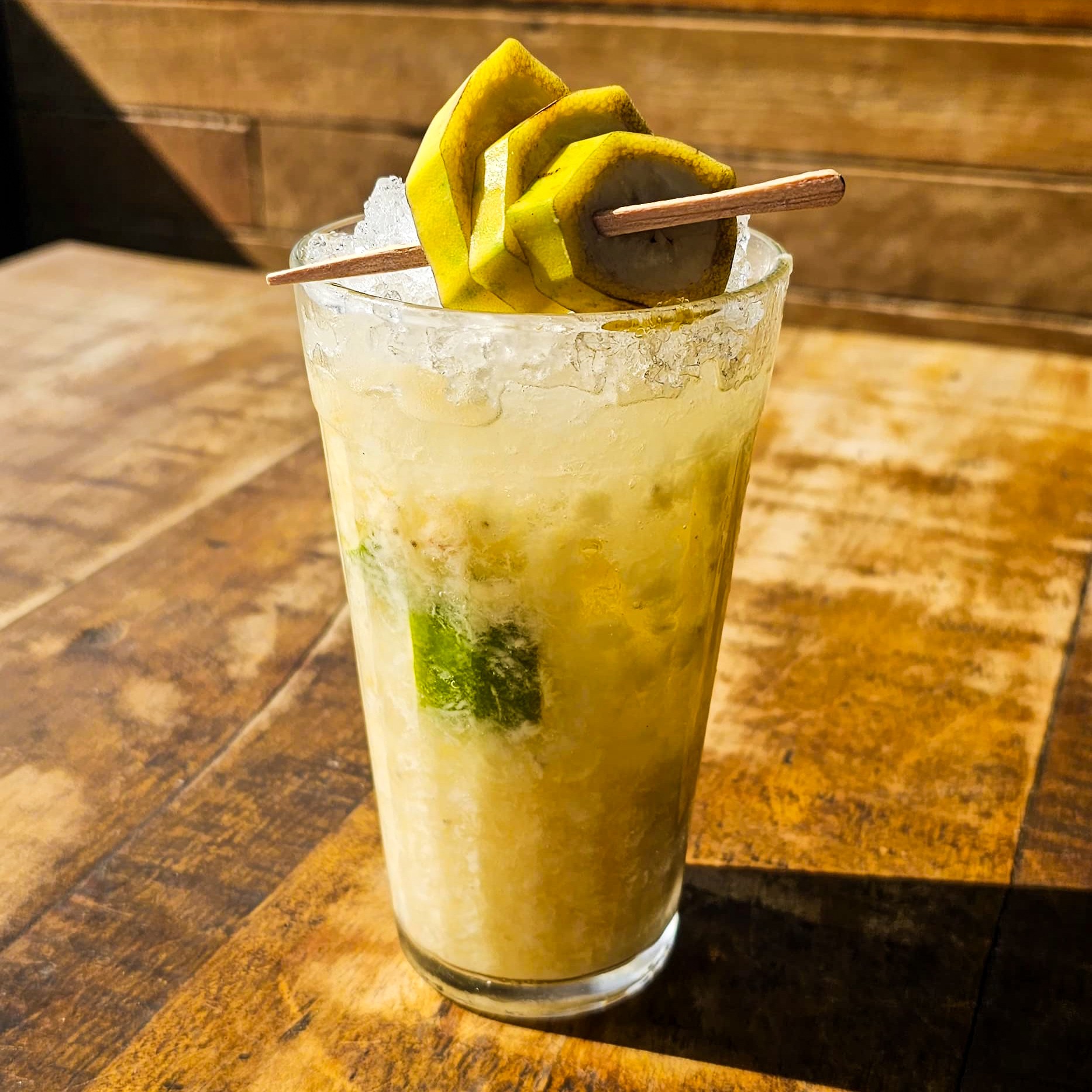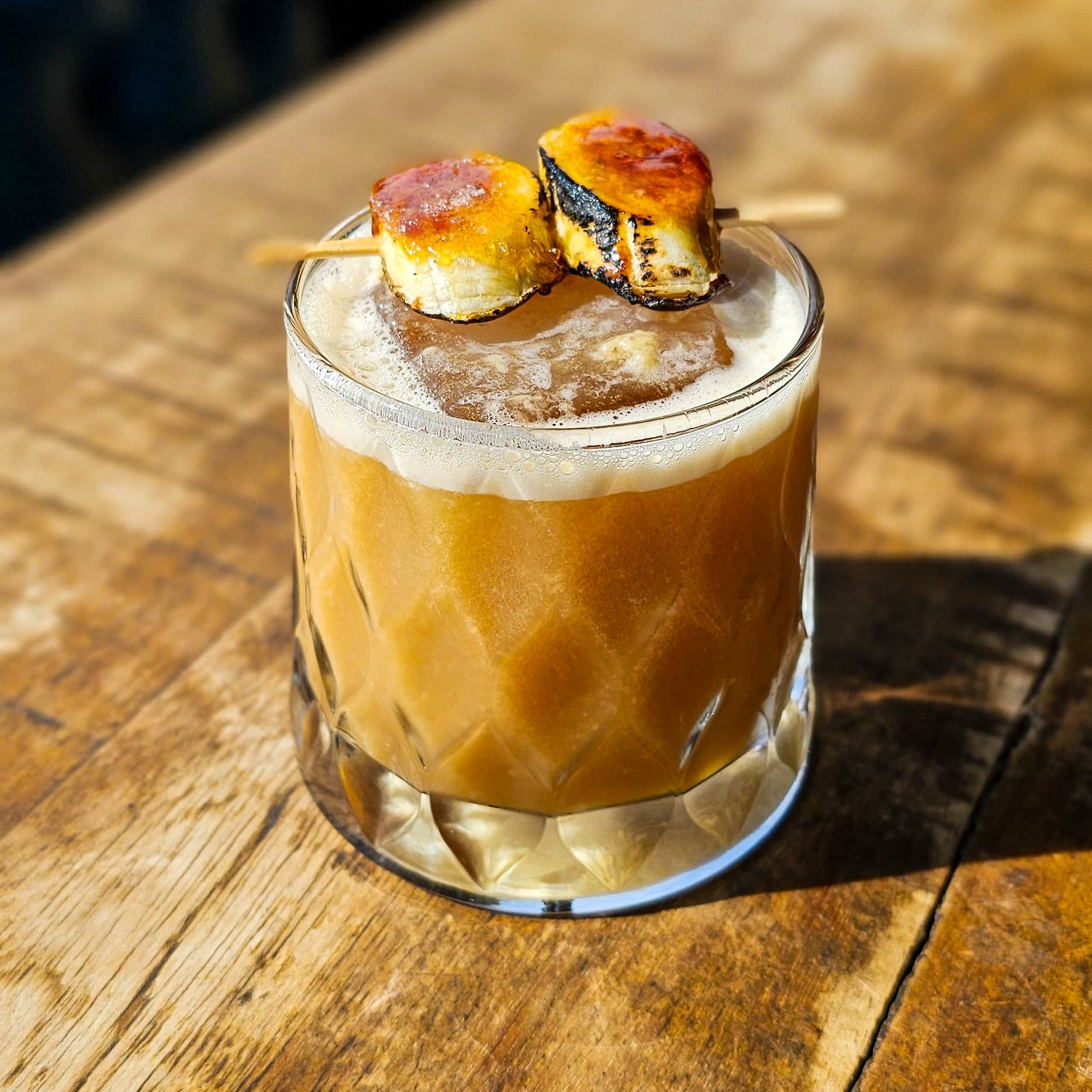 A intensidade do whisky bourbon harmonizada com o amargor suave do Amaro Averna, o dulçor do xarope de banana e o frescor do suco de limão siciliano, resultando em um drink equilibrado e cheio de personalidade.