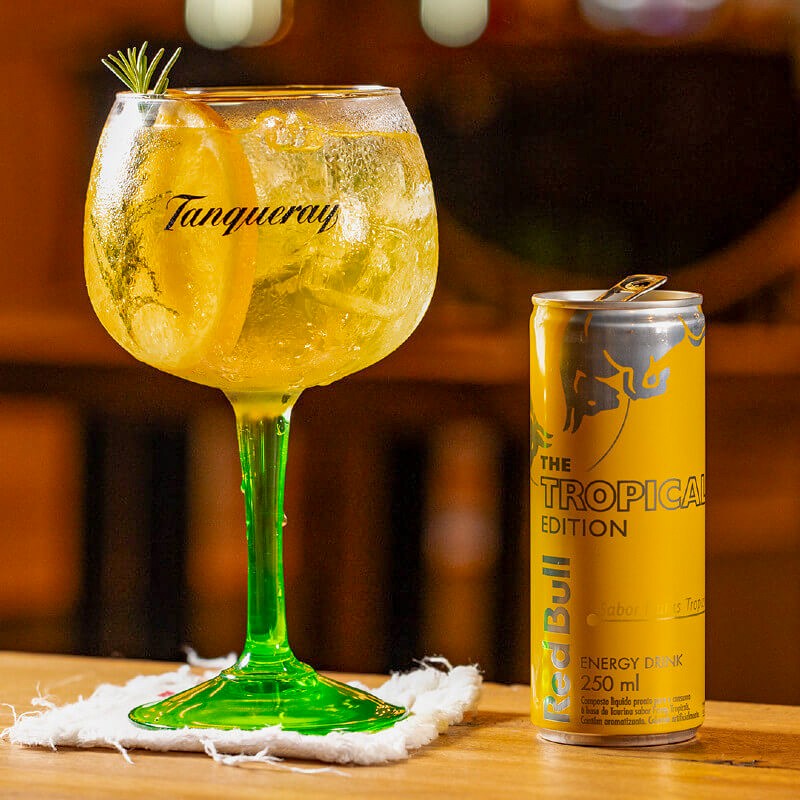 A suavidade do gin harmonizada com o dulçor do licor de pêssego e a refrescância do Red Bull Tropical, criando um drink leve, frutado e cheio de energia.