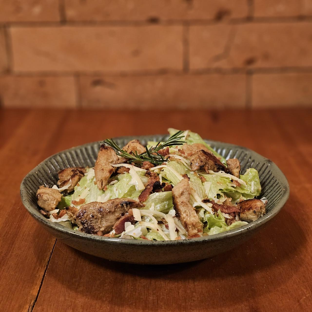 Folhas frescas e crocantes de alface, envoltas no clássico molho Caesar, acompanhadas de croutons dourados, lascas generosas de parmesão, tiras suculentas de filé de frango grelhado e o toque especial do bacon crocante. Uma combinação clássica, cheia de sabor e textura.
