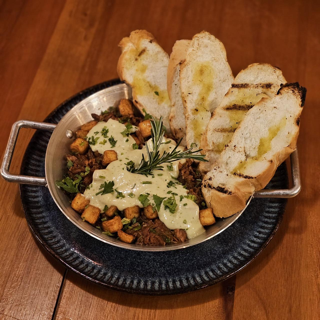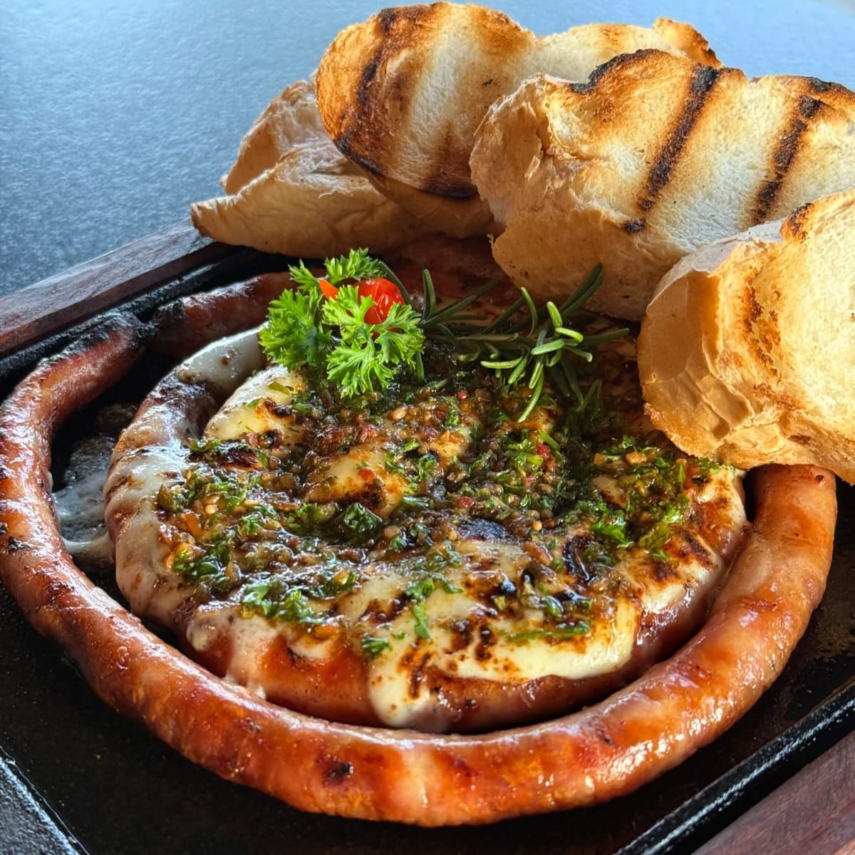 Servida com nosso molho de pimenta artesanal, finalizada com chimichurri fresco, lascas de queijo e pão artesanal. Um toque especial para completar sua experiência.