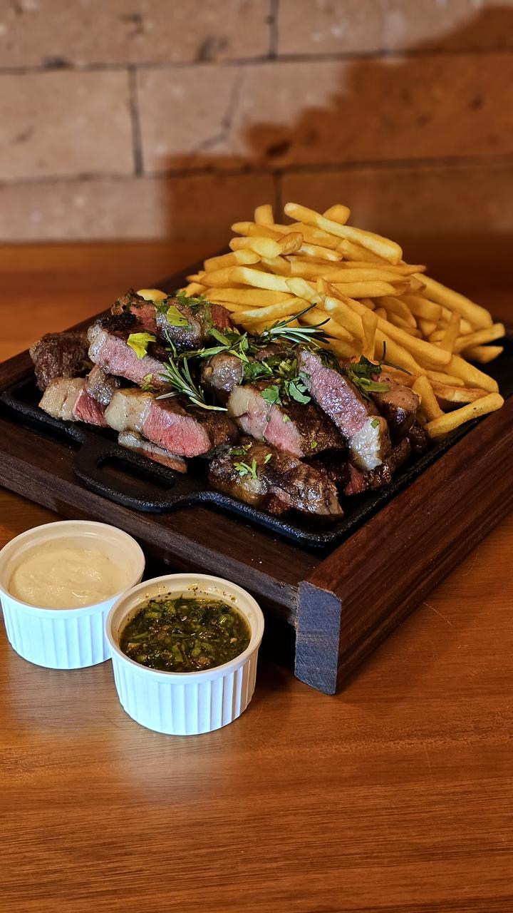Suculentos cortes de mignon preparados na chapa, no ponto perfeito. Servidos com clássicas batatas fritas fininhas e crocantes. Um prato generoso, ideal para compartilhar ou se entregar sem pressa.