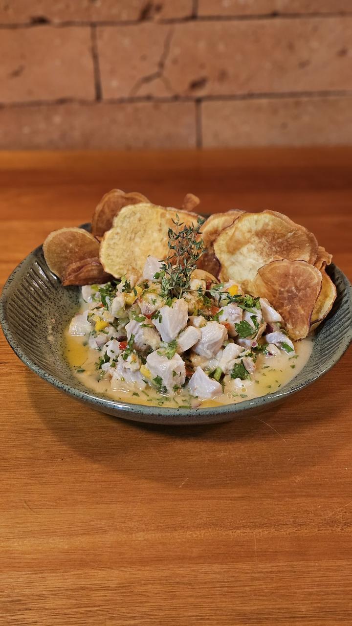 Cubos frescos de Saint Peter marinados no limão, acompanhados de tomate, cebola roxa, pimentões coloridos e o toque vibrante da pimenta dedo-de-moça. Servido com crocantes chips de raízes. Um clássico refrescante, com sabores intensos e equilibrados.