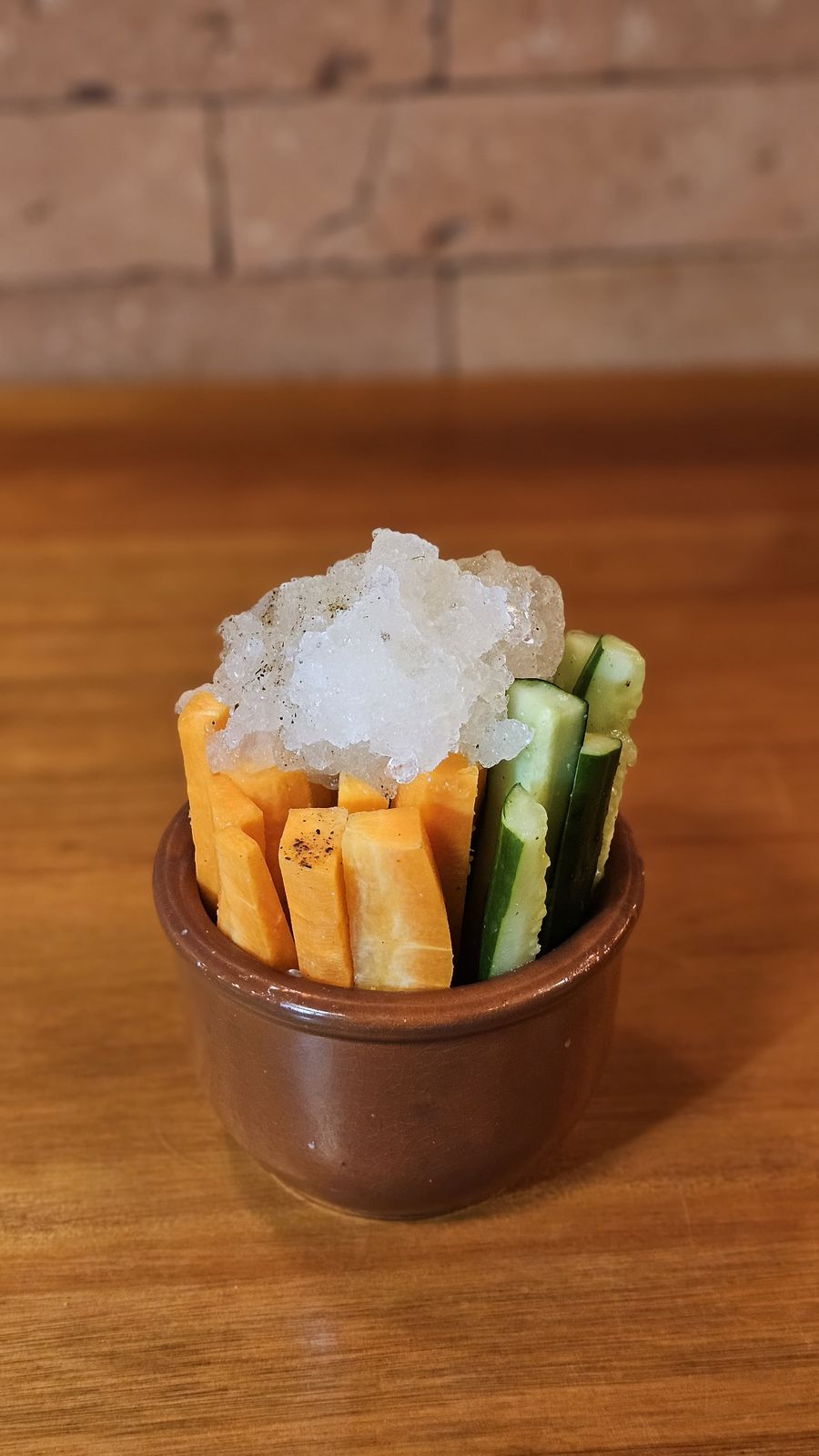 Crocrantes palitos de cenoura e pepino, servidos sobre gelo moído, finalizados com um toque de cachaça e uma pitada de sal. Refrescante e surpreendente, um convite ao paladar.