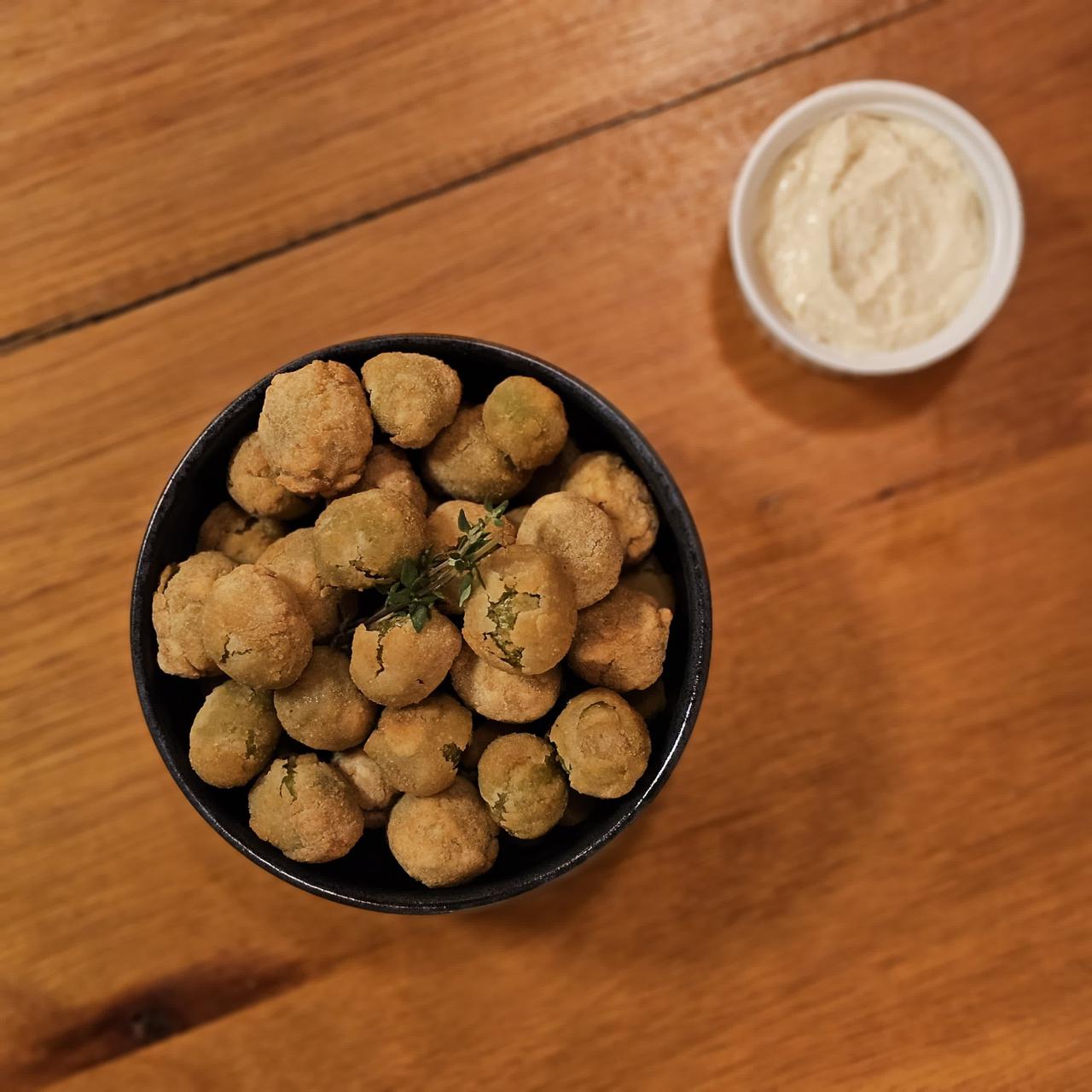 Azeitonas recheadas, empanadas na leveza do tempurá e fritas até a crocância ideal. Servidas com molho de alho da casa. O petisco perfeito para acompanhar um chopp bem gelado.