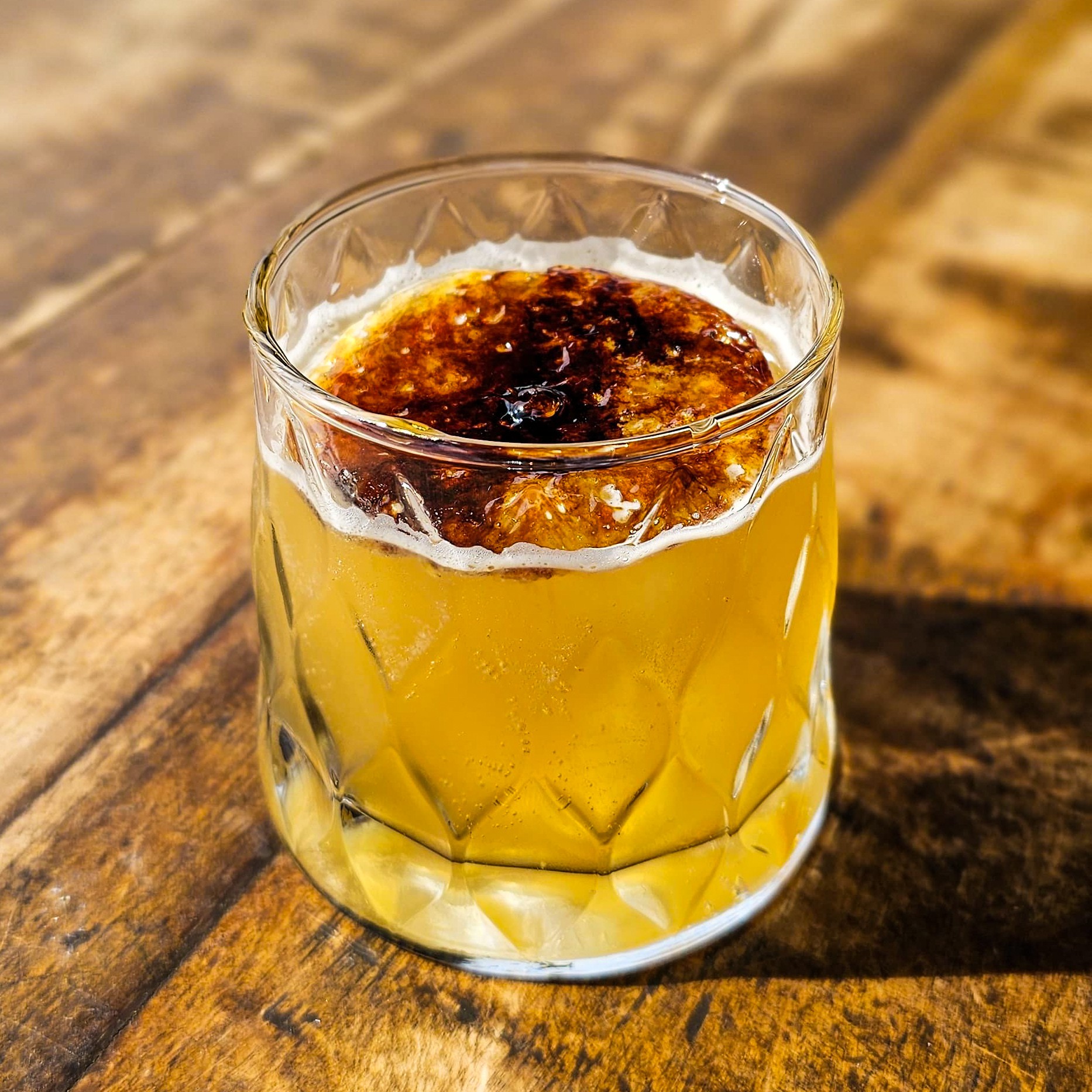 A robustez do whisky bourbon equilibrada pelo caramelo salgado, com notas amargas do bitter de chocolate, o frescor do suco de limão siciliano e o toque final da lâmina de laranja caramelizada. Um drink intenso, sofisticado e cheio de camadas de sabor.